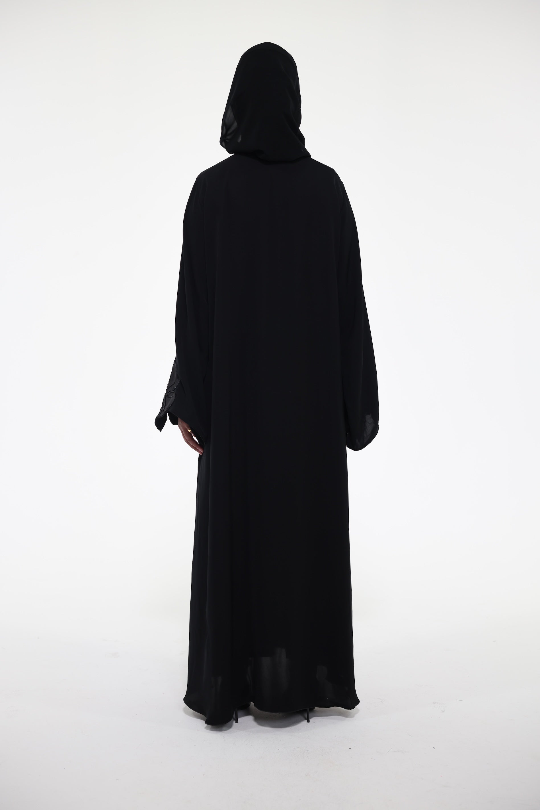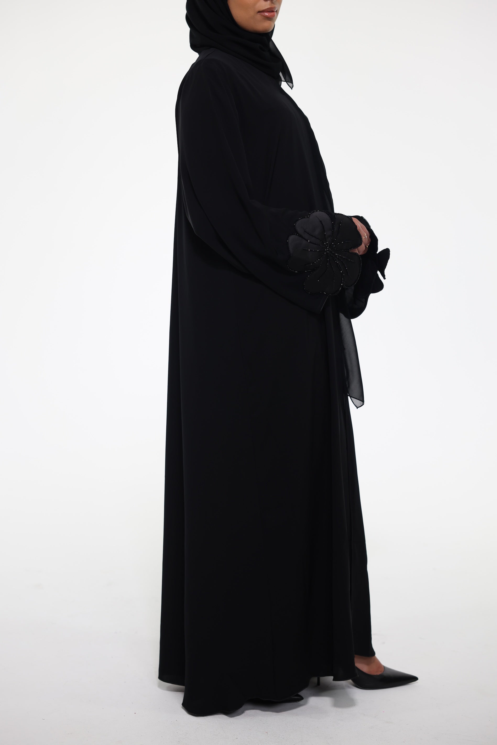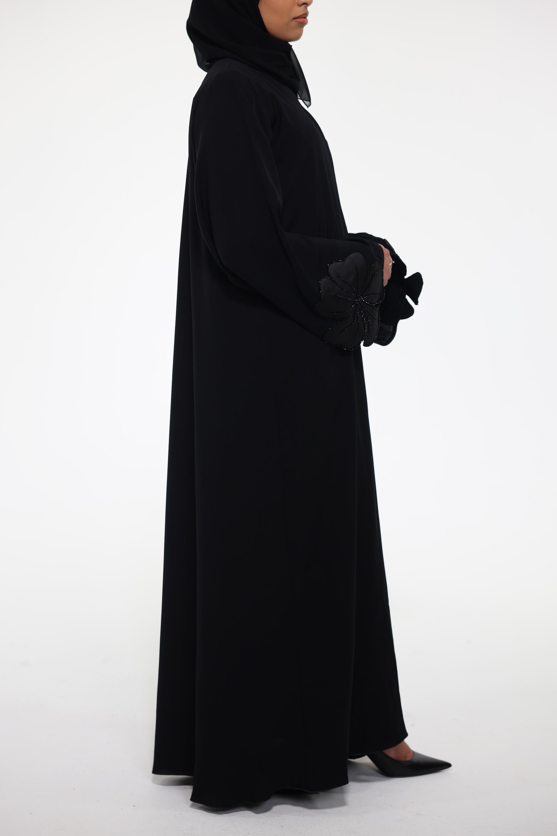 Floral abaya that luxurious and minimalist. This abaya features an umbrella cut silhouette, and intricate detailing beaded detailing at the sleeves, giving it a subtle sparkle and a luxurious finish.